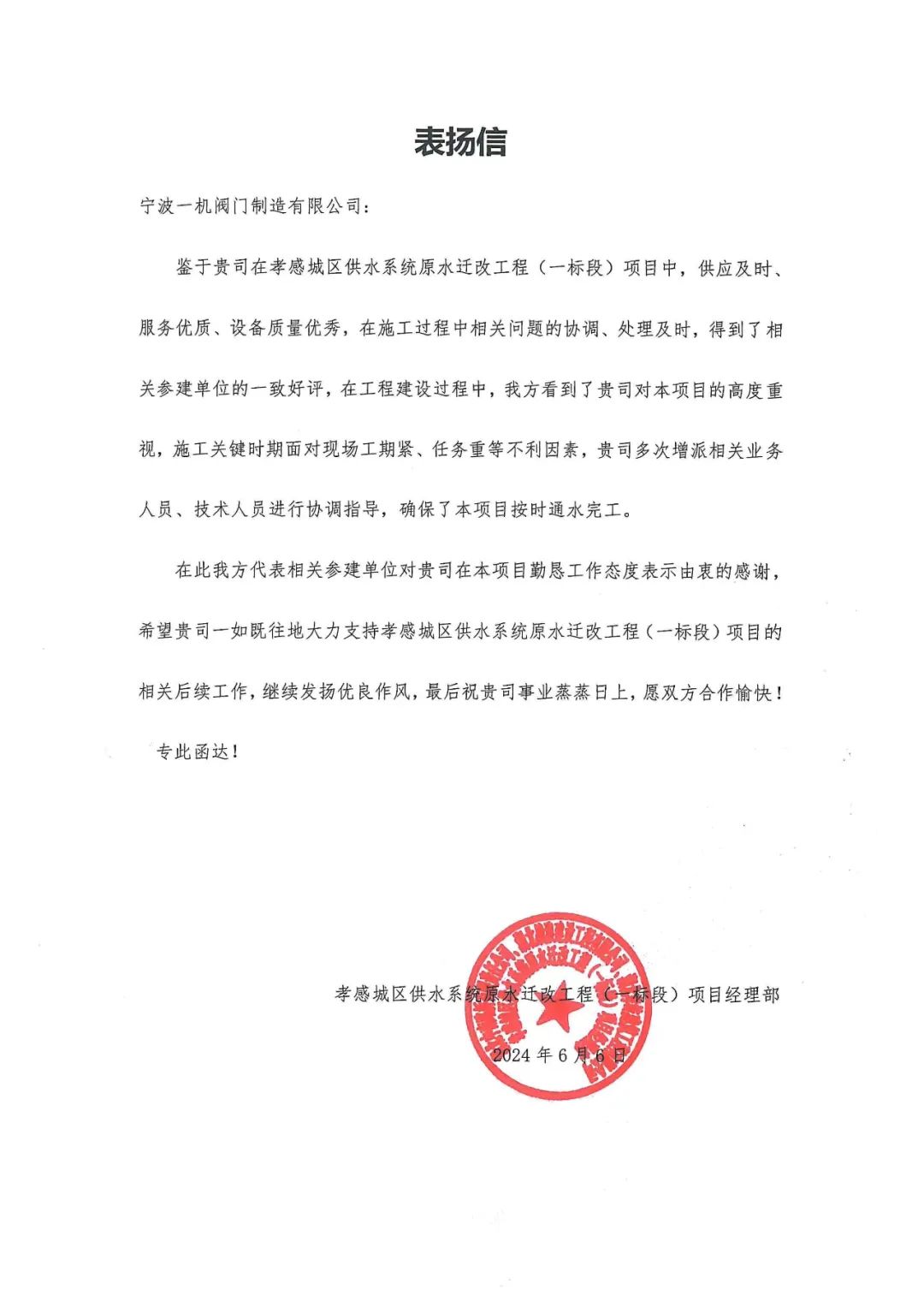 付出總有回報(bào),客戶(hù)對(duì)我們的認(rèn)可是對(duì)我們最大的鼓勵(lì)!讓我們以這份榮耀為新的起點(diǎn),繼續(xù)努力,不斷創(chuàng)新,為客戶(hù)創(chuàng)造更多的價(jià)值,為行業(yè)發(fā)展貢獻(xiàn)更大的力量。讓一機(jī)閥門(mén)的榮耀在歲月的長(zhǎng)河中熠熠生輝,永不褪色!在這個(gè)特別的 2024 年 6 月6日,讓我們一起為一機(jī)閥門(mén)的榮耀歡呼,一起期待更加輝煌的明天!